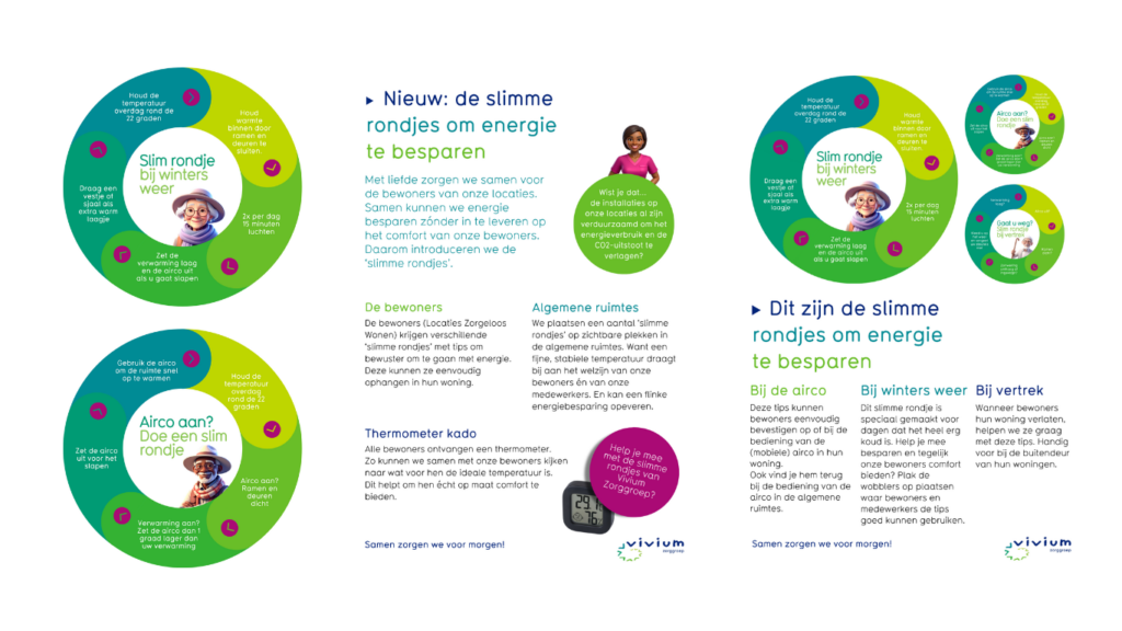 Voor zorgorganisatie Vivium Zorggroep ontwikkelden we een interne campagne om medewerkers en cliënten bewust te maken van energie besparen. Van strategie tot de uitwerking van middelen zorgden we voor een heldere en herkenbare lijn. Met toegankelijke visuals en praktische tips vertaalden we het thema energie besparen naar de dagelijkse zorgomgeving, zodat iedereen eenvoudig kon meedoen en bijdragen.